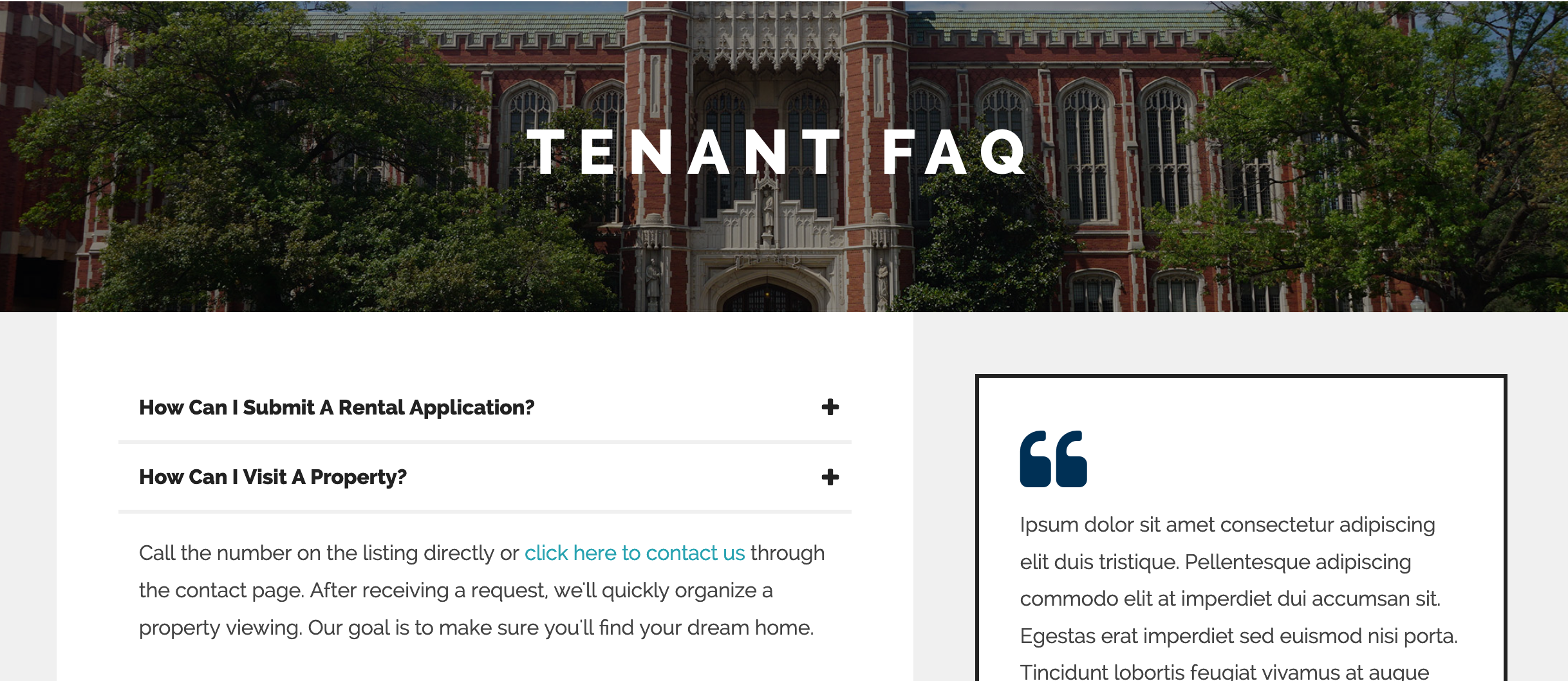 Like the Default template, the FAQ Template has its content on the left and sidebar on the right. However, the content appears in an Accordion, allowing users to click on a question and read the answer. This helps users find their question quickly, wihout needing to scroll through a wall of text to do so.