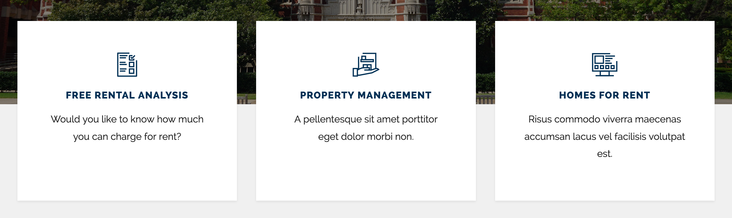 The Modular/Services Template is a two-column layout that displays a title, a short piece of copy, and a button in one column and a related image in the other. As new services are added, the Image and Text columns alternate automatically. Although we primarily use this Modular Template for listing Services offered (Property Management or Real Estate for example), there's nothing stopping you from using it to display other content in this format.