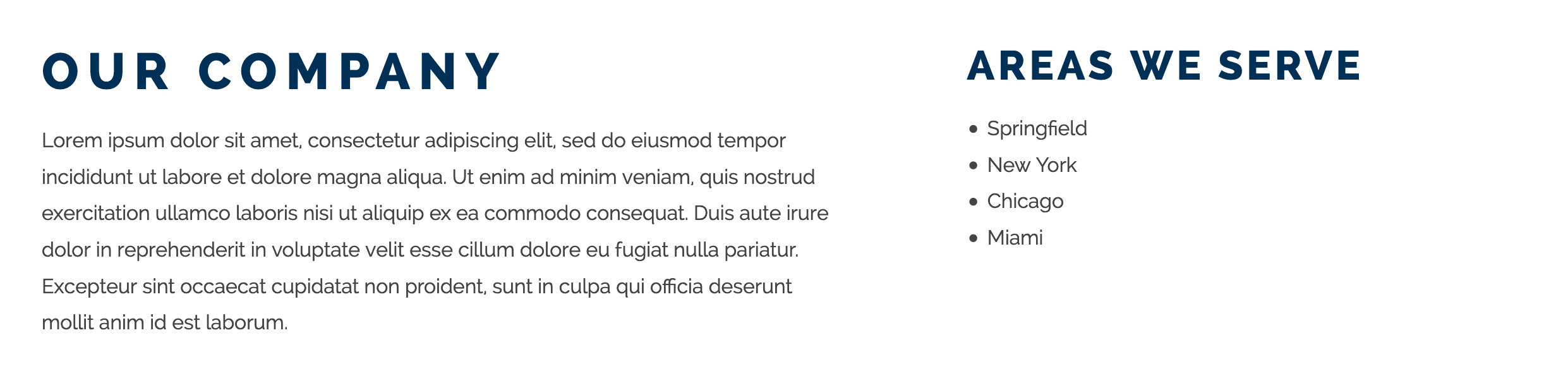 The Modular/Company Template is a two-column layout with two functions. On the left, you have a short description of your company and the services it offers. To the right you have a list of Areas Served as well as links to the pages dedicated to each of those areas. These Areas and links are then reused throughout the site in order to minimize the duplicate work and human error.