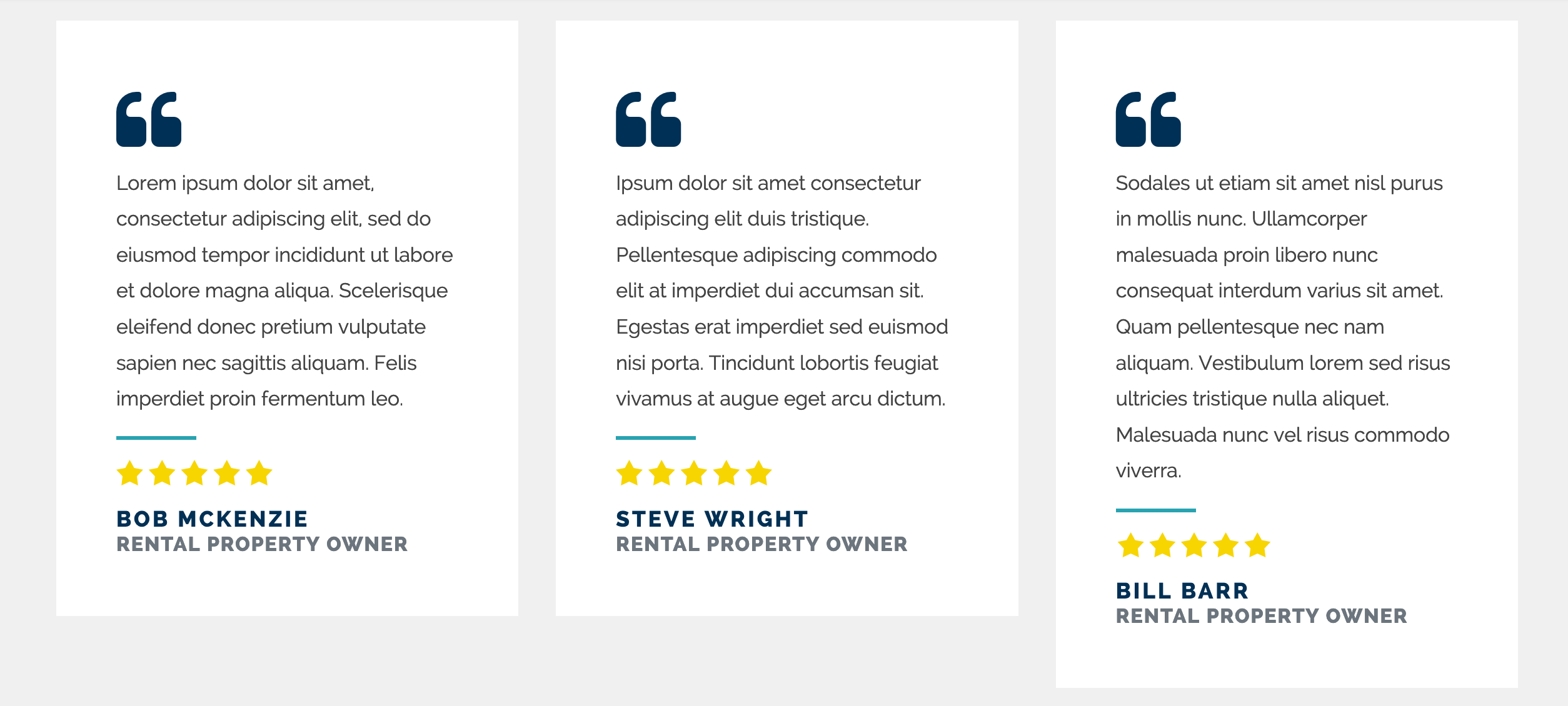 As the name suggests the Modular/Testimonials Template is designed to display Client Testimonials on a page. Keep in mind that this is different than the standard Testimonials, which lists Testimonials on a stand-alone page. You can enter a maximum of 3 Testimonials per Page, but some themes may only display one at a time.